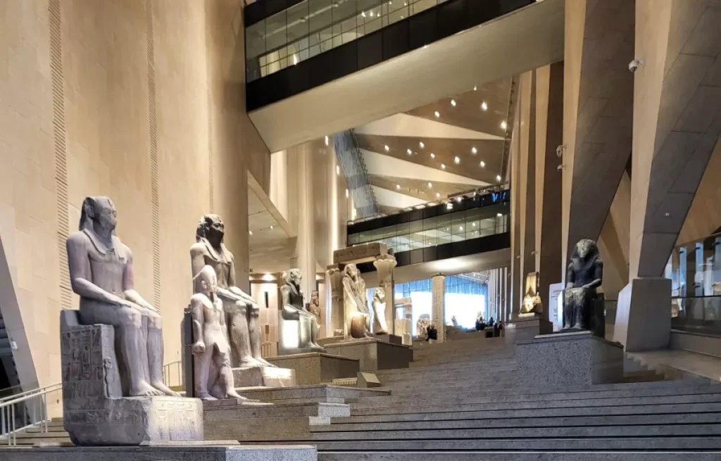 The Grand Egyptian Museum, perched impressively on a plateau just two kilometers from the pyramids, is not only convenient, but also legendary. Imagine ancient pharaohs looking out from their tombs at this same spot. Chills, right? The museum’s architecture reflects the surrounding desert landscape, with gigantic stone facades that appear to emerge spontaneously from the earth itself. Don’t be fooled by the simple exterior.