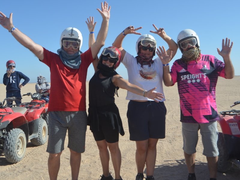 Veți fi preluați de la hotelul dumneavoastră cu un jeep și veți merge în marele Deșert de Est din Hurghada. Bucurați-vă de condus un quad (aproximativ 40 de minute) și o mașină spider (aproximativ 15 minute). Cu un jeep veți merge într-un sat semi-nomadic. Călăriți o cămilă sau un cal și observați nomazii la munca zilnică. Înapoi cu jeep-ul, relaxați-vă cu o shisha plăcută și bucurați-vă de o cină locală tipică și un spectacol oriental. După cină, jeep-ul vă va întoarce la hotelul dumneavoastră.
